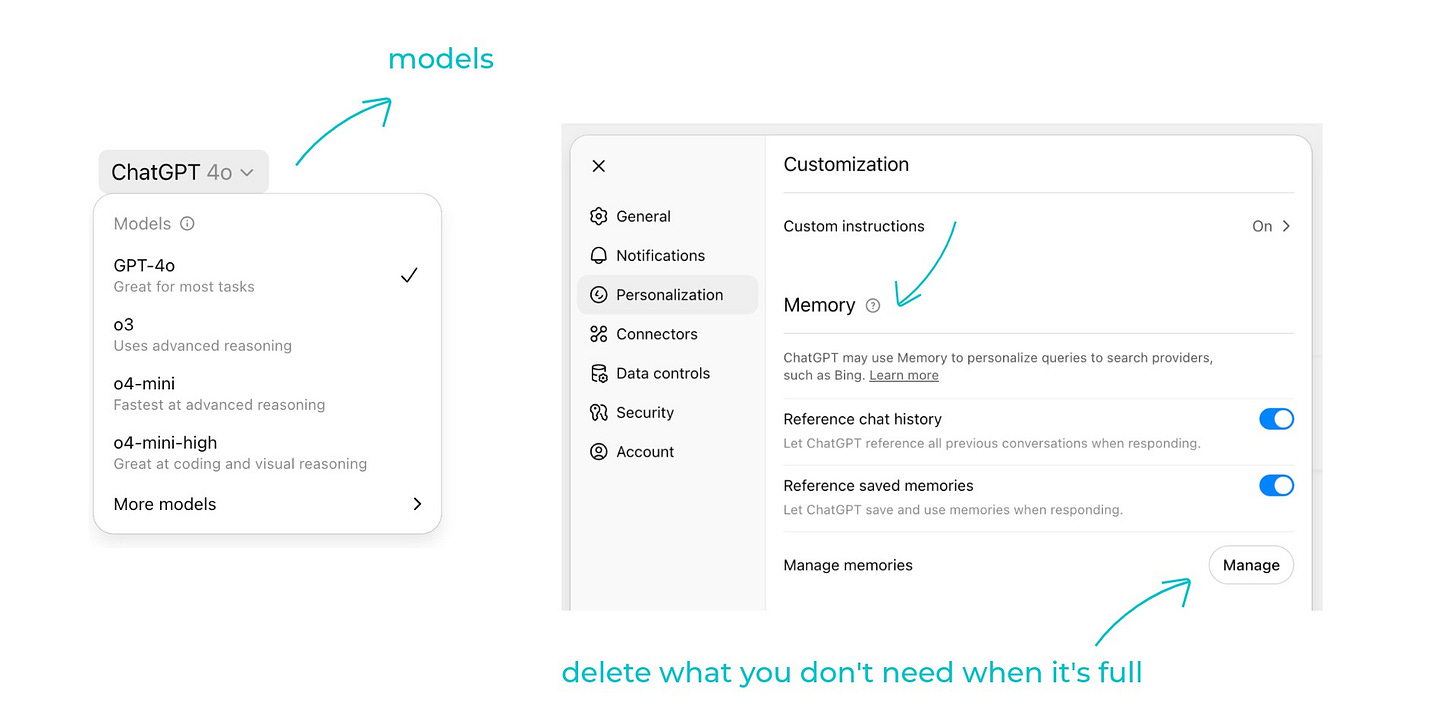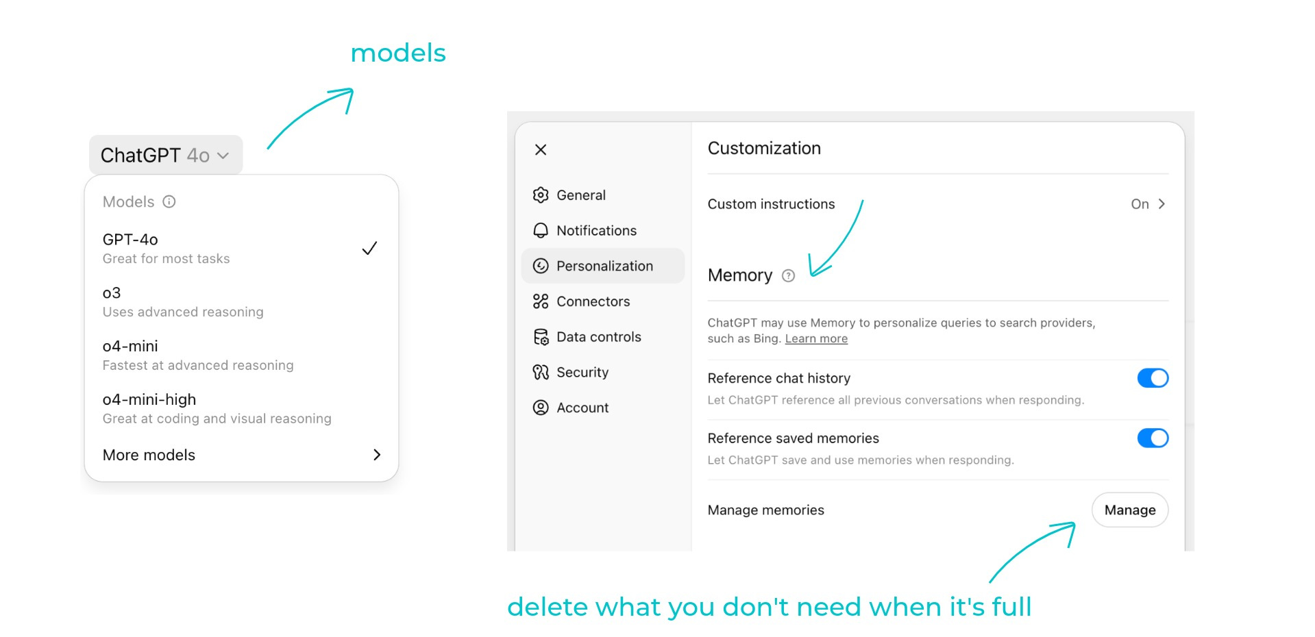 Memory in chatGPT = works in two ways: saved memories and chat history. But the bottom line is, with memory enabled, it remembers your preferences. It stores certain information about you that may be important and relevant for future conversations. More here on reference chat history and reference memory.